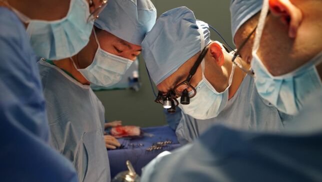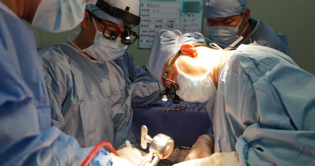 黑龙江省器官移植中心主任、哈医大二院普外科六病房主任邰升教授(右1)和普外科一病房副主任钟翔宇教授(左2)带领团队完成首例利用“废弃肝脏”进行脾窝异位辅助肝脏移植手术