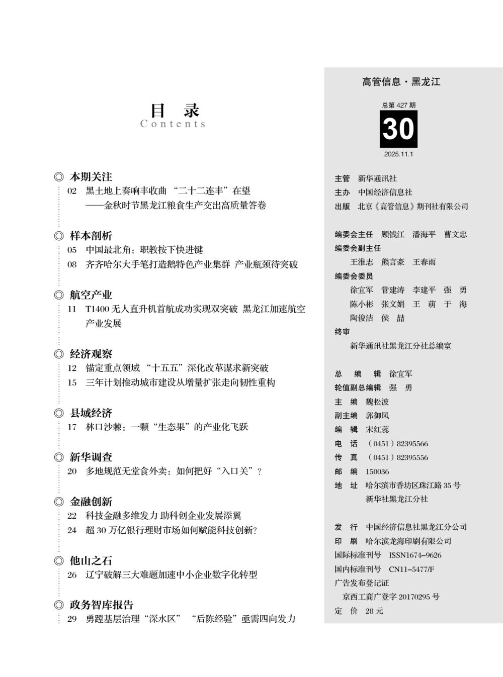 《高管信息》是新华社主管、中国经济信息社主办,具有国内统一刊号的经济信息期刊,主要刊登新华社记者采写的参考报道、决策信息,传达中央最新精神、解读最新方针政策,介绍各地各领域新成就、新经验以及遇到的新问题、新情况。《高管信息·黑龙江》紧紧围绕龙江各地党委政府中心工作,聚焦经济社会发展经验做法、问题困难、对策建议,为各级党政机关、企事业单位领导提供决策参考。