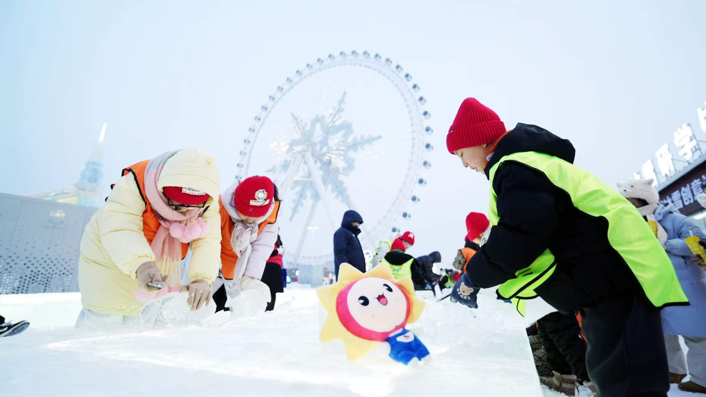 孩子们在冰雪大世界内动手制作冰雕