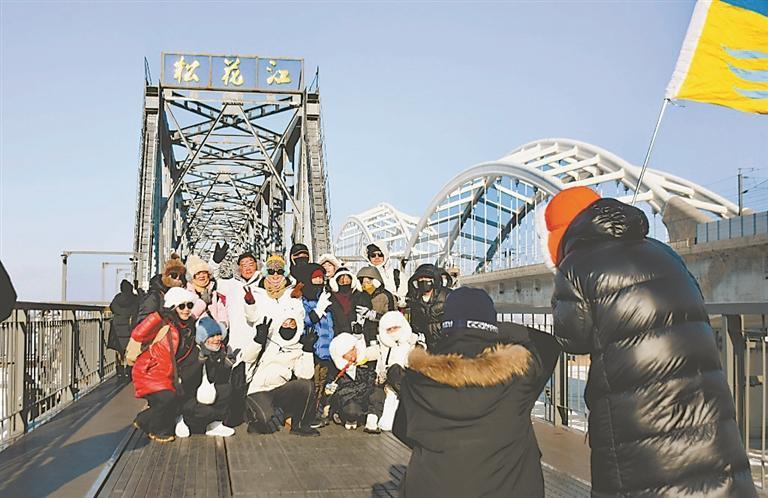 松花江滨洲铁路桥上,每天都有许多南方游客前来打卡拍照。江面上冷风吹拂,却丝毫不影响游客的热情。