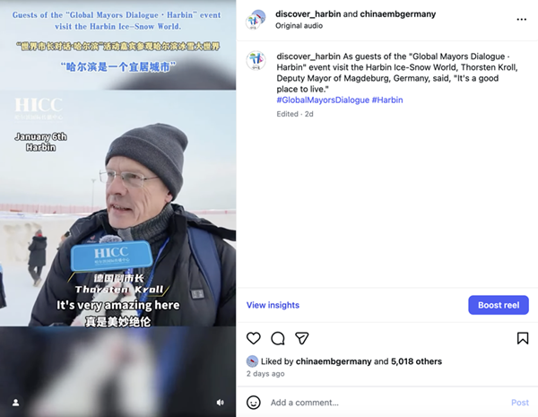 中国外交部发言人X账号(@MFA_China)也两次转发哈尔滨官方X账号关于本次活动的帖文。中国驻德国大使馆Instagram账号(@chinaembgermany)与哈尔滨官方Instagram账号合作,共同发布参加本次“世界市长对话·哈尔滨”活动的德国马格德堡市副市长索斯藤·克罗尔的采访视频,实现了海媒账号间的“同频共振”,而中国气象局X账号(@cmanewsinfocus)对其的转发更是进一步延伸了本次对话的传播链条。
