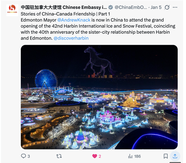 其中,中国驻美国大使馆X账号(@ChineseEmbinUS)在哈尔滨冰雪节推文中@哈尔滨官方X账号。中国驻加拿大大使馆X账号(@ChinaEmbOttawa)和中国驻多伦多总领馆X账号(@ChinaCGToronto)发布、转发哈尔滨官方X账号帖文,全面呈现加拿大埃德蒙顿市长安德鲁·纳克参会实况、追溯两市冰雪渊源,并与哈尔滨X官方账号积极互动;值得关注的是,安德鲁·纳克的个人Instagram账号(@andrewknack)也点赞了哈尔滨官方X账号的活动启幕内容。