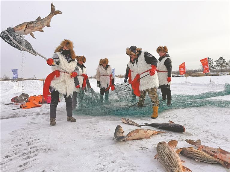 药泉湖畔人头攒动,热闹非凡,火山堰塞湖冬捕活动在此拉开序幕。“起网出鱼喽!”高亢嘹亮的号子声突然响彻冰面,将冬捕活动推向高潮。“鱼把头”与身着传统东北皮毛大衣的渔民们齐力拉动渔网,沉重的渔网从冰洞中缓缓升起。刹那间,水汽蒸腾,冰花四溅,一条条身肥体壮的矿泉鱼在网中跳跃翻腾,鳞片在阳光下闪闪发光。