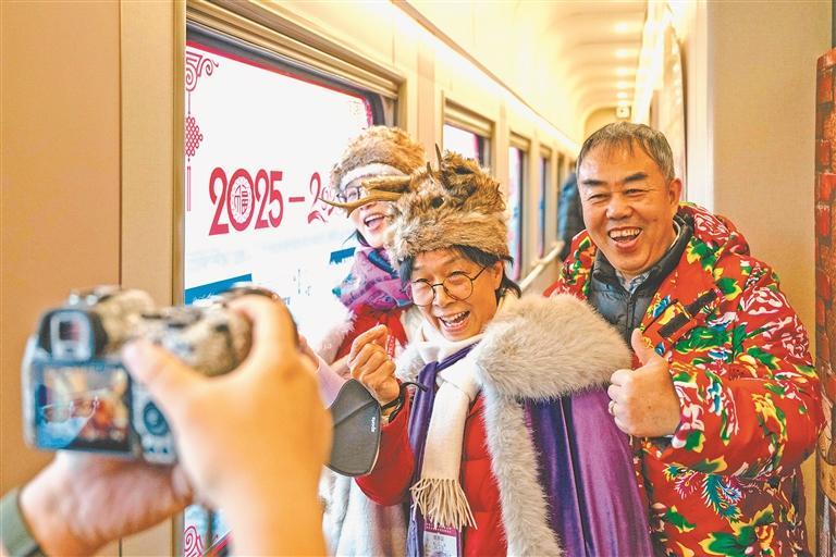 龙江冰雪游持续火热,吸引越来越多南方游客前往省内各地打卡留念,旅拍服务成为网红打卡项目。哈尔滨局集团公司大力推进“铁路+旅游”深度融合,依托哈尔滨站、亚布力站等独特的建筑风格,在哈尔滨至亚布力间的旅客列车上开展免费旅拍服务,打造主题车厢,提供妆造、主题服装,成立旅拍团队。