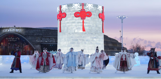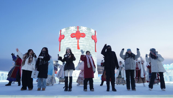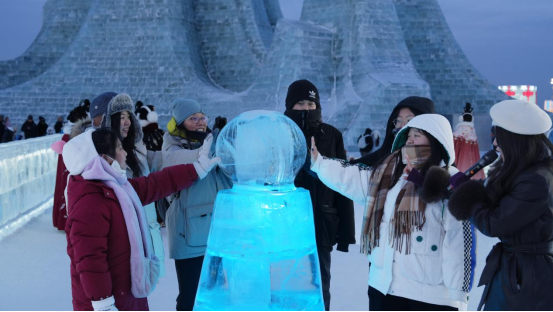 活动现场氛围热烈,舞蹈表演轮番上演,吸引众多游客驻足。伴随着《北京欢迎你》的熟悉旋律,来自北京的游客与各地游客汇聚主塔下,共同等候点亮时刻。夜幕降临后,在全场观众的倒数声中,六位北京游客同步触碰主塔点亮开关,由万千块冰砖雕琢而成的主塔由下至上缓缓亮起,冰的剔透与光的灵动交相辉映,尽显冰雪艺术的独特魅力。