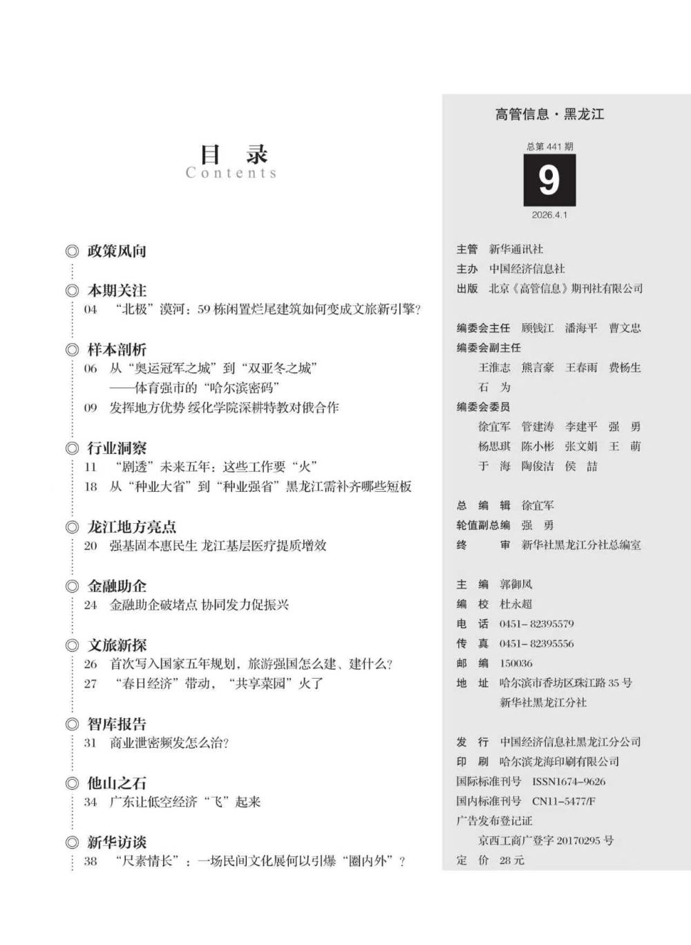 《高管信息》是新华社主管、中国经济信息社主办,具有国内统一刊号的经济信息期刊,主要刊登新华社记者采写的参考报道、决策信息,传达中央最新精神、解读最新方针政策,介绍各地各领域新成就、新经验以及遇到的新问题、新情况。《高管信息·黑龙江》紧紧围绕龙江各地党委政府中心工作,聚焦经济社会发展经验做法、问题困难、对策建议,为各级党政机关、企事业单位领导提供决策参考。